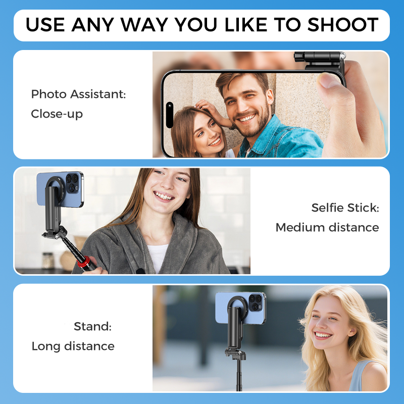 VIELSEITIGKEIT IN EINEM – Lässt sich mühelos vom kompakten Aufnahmegriff zum ausziehbaren Selfie-Stick oder stabilen Vierbeinstativ verwandeln. Dieses multifunktionale Werkzeug passt sich jeder Situation an, vom Vloggen unterwegs bis zum Gruppenfoto.