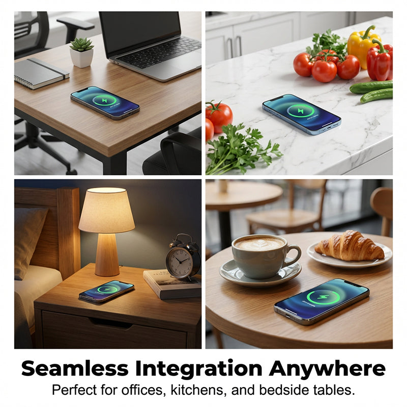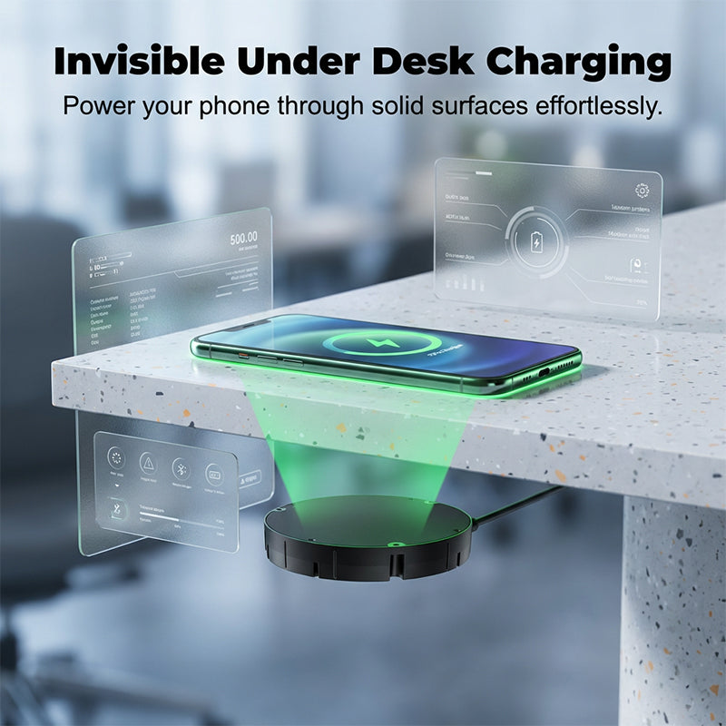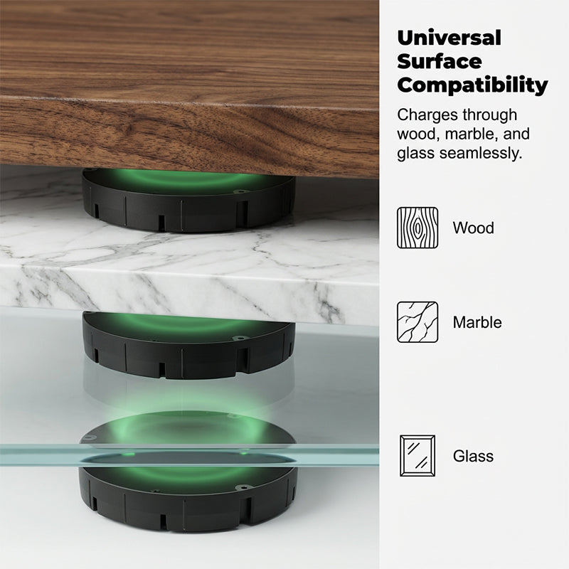 LANGSTRECKEN-LEISTUNG - Überträgt Energie durch nichtmetallische Oberflächen mit einer Dicke von bis zu 25 mm, darunter Holz, Marmor, Glas und Quarz. Sie können Ihr Smartphone direkt auf der Tischplatte aufladen, ohne die Schutzhülle entfernen zu müssen – für mühelosen Komfort.