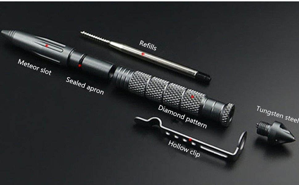 The tactical pen cap is crafted from tungsten steel, while the pen body is made from aerospace-grade aluminum, offering exceptional strength and portability. Designed to break windows for emergency escapes, this pen is a reliable tool in critical situations.