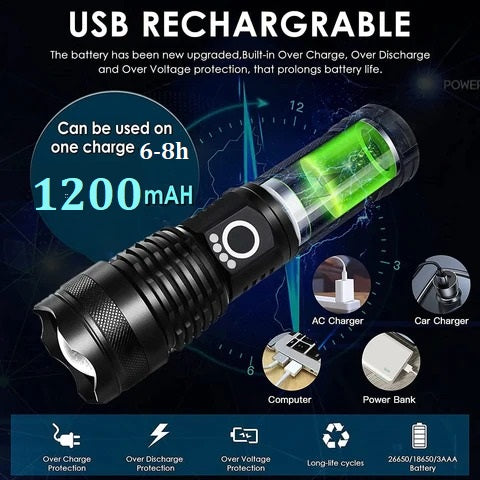 The MilitaryKart Rechargeable Tactical Flashlight is designed to be tough, reliable, and easy to carry. Made with military-grade anodized aluminum, it’s impact-resistant up to 16 feet, lightweight at just 16 oz, and compact enough to fit in your pocket or backpack.