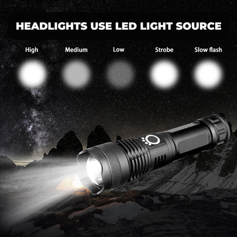 This flashlight comes with five adjustable light modes—low, medium, high, strobe, and SOS—giving you the right lighting for any situation. It provides an impressive beam distance of up to 500 meters, perfect for outdoor adventures or emergency use.
