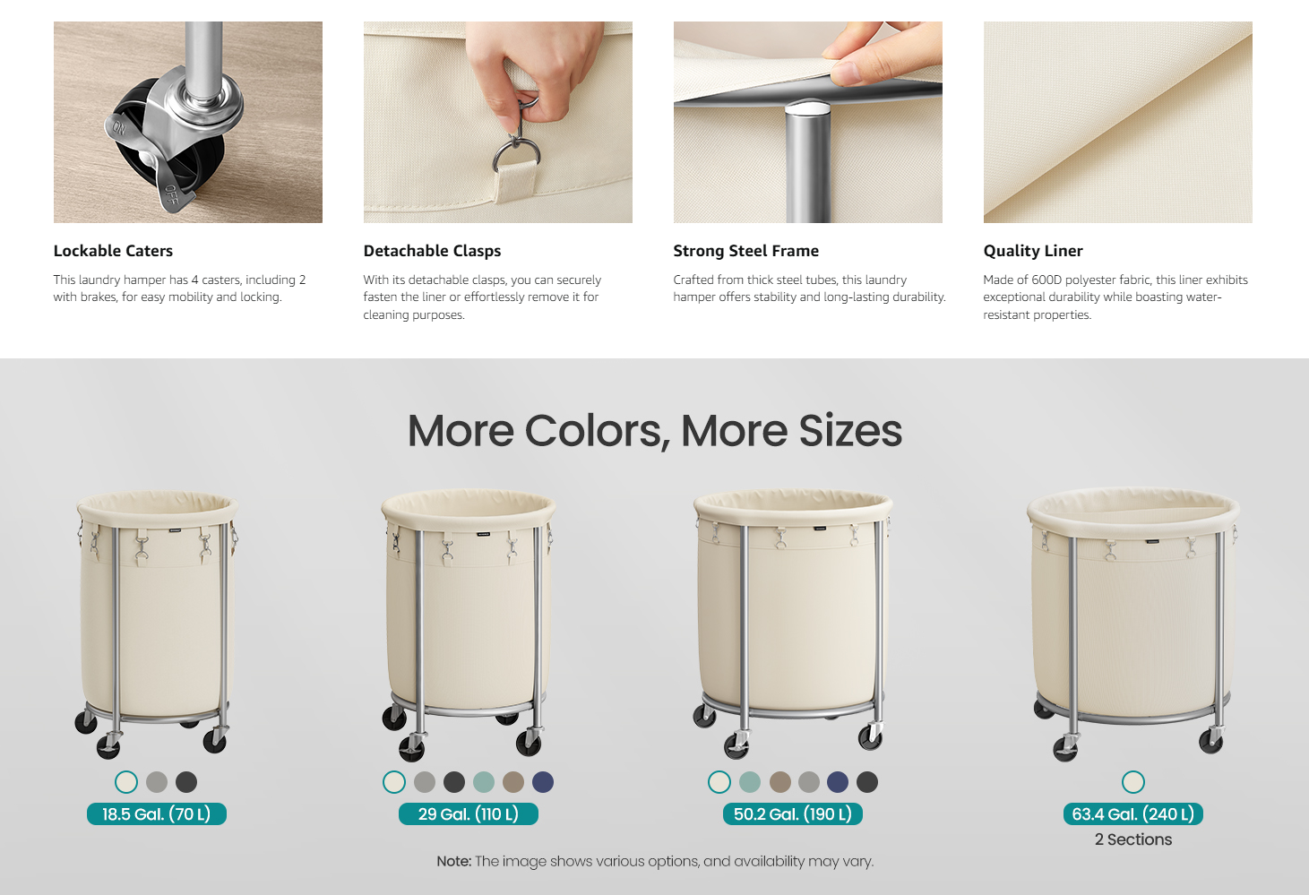 ·[Plenty of Storage Space] With a size of 23.6"Dia. x 31.9"H, this laundry basket on wheels has a large capacity for lots of clothes and bedding sheets, letting you easily do all of your laundry in a single trip