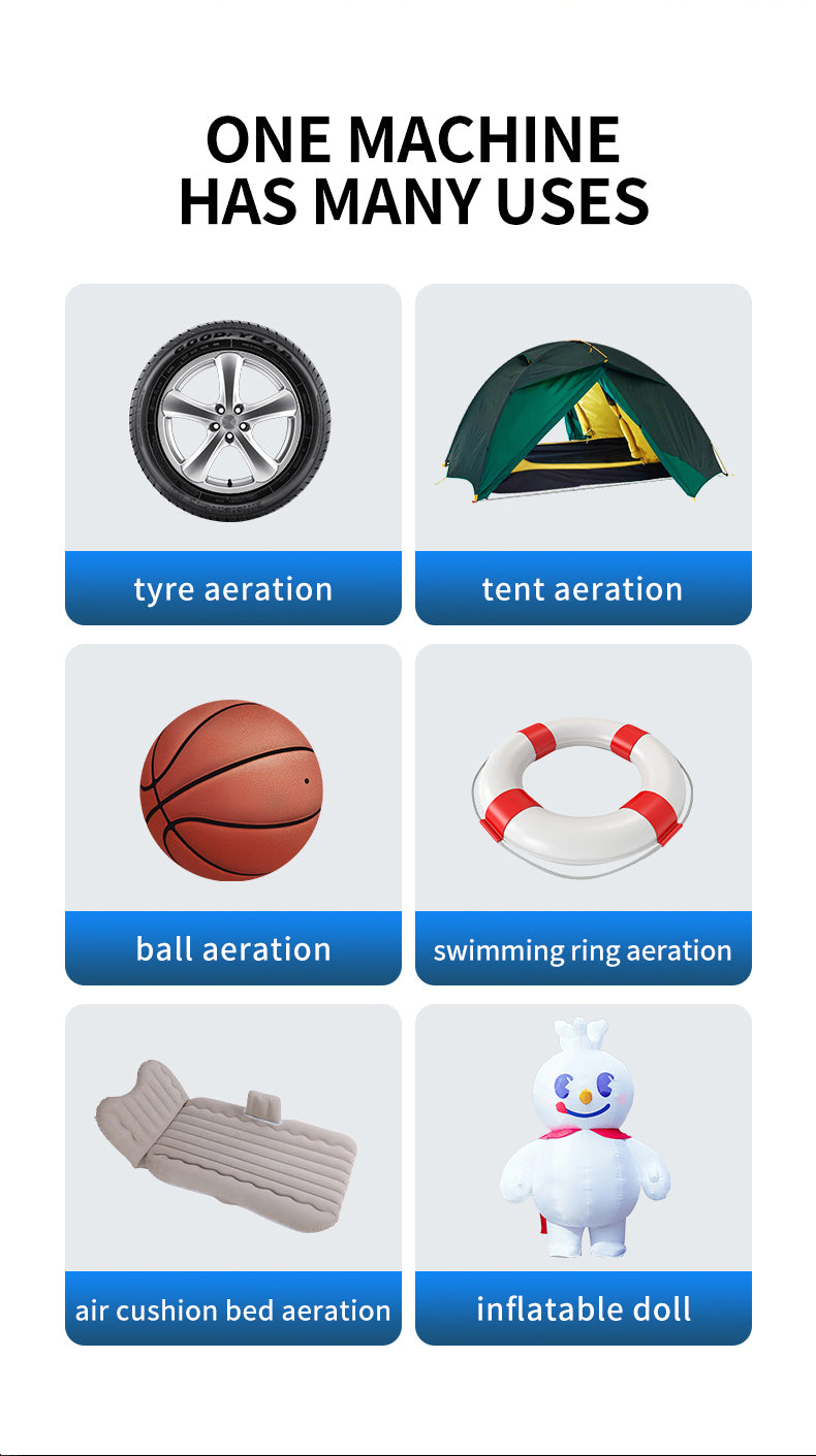 Smart Inflator with LCD ScreenSmart preset & auto shut-off without repeated adjustment and check. With unique turbocharged 40L/Min (150 PSI) lasting 25 minutes. The portable car jump starter with air compressor quickly inflates a car tire to 20 PSI in just 2 minutes, 3 different nozzles for inflating cars, bikes, balls, etc. Large LCD display to read real-time data, 3 optional unit switching and detachable extended air hose for ease of use