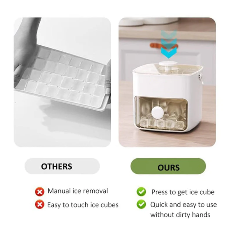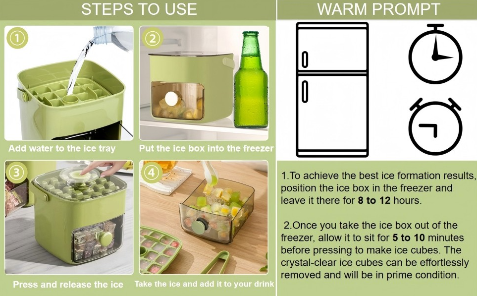 CREATIVE ICE CUBE TRAY: Simply place the frozen ice mold upside down on the ice storage box and press the button on the lid with your finger, then you can easily remove the ice cubes.