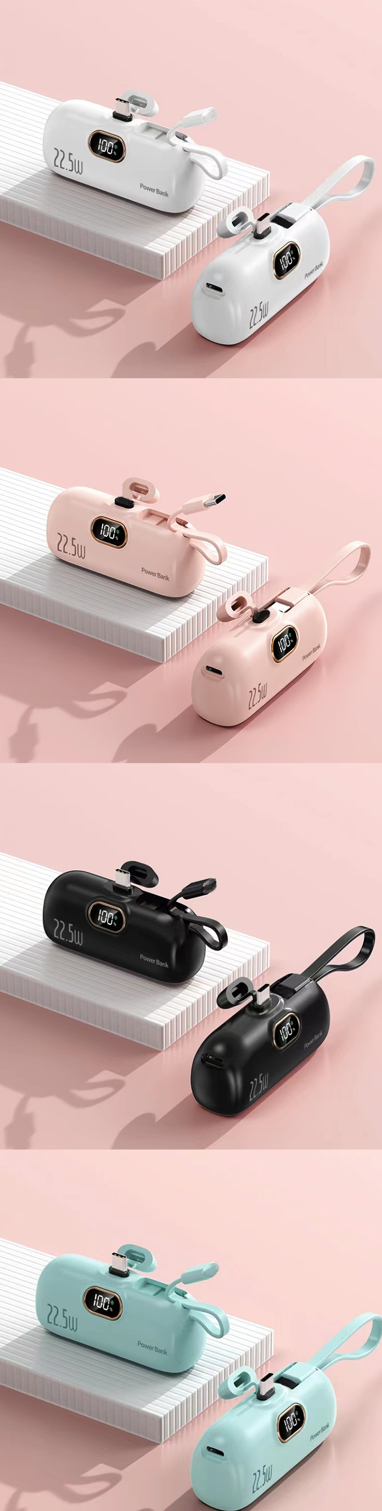 5000 mAh Mini Power Bank for mobile phones, 22.5W fast charger with three ports and digital display, lightweight and compact.